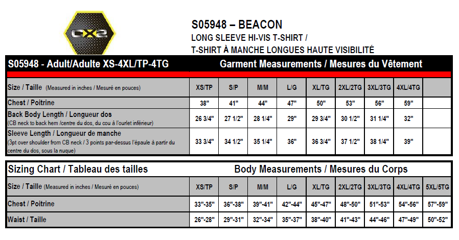 130 gsm - 3.8 oz./yd² - 6.5 oz./lin.yd 100% polyester birdseye mesh with wicking finish. Self fabric neckline. Rib knit cuff. Chest pocket. Tear away label. 4” hi-vis contrast band with 2” reflective tape on front and back body and sleeves. Meets CSA standards.