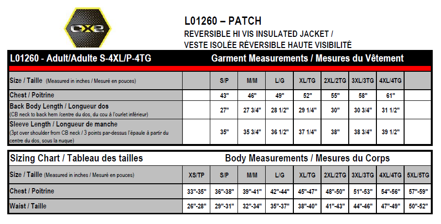 195 gsm – 5.8 oz./yd– 9.5 oz./lin. yd 100% polyester mechanical stretch oxford 2000 mm waterproof rating, 800 gsm breathability rating, wind resistant and water repellent finish. Insulation: 80gsm 100% polyester.  Taped seams for rainwear purposes.  YKK reversible front plastic zipper and two lower reverse coil pocket zippers.  4” hi-vis contrast band with 2” reflective tape on front and back body and sleeves.  Meets CSA standards.  Reverse the garment to 100% polyester water repellant taffeta. Two lower reverse coil zipper pockets. Lightly insulated for transitional purposes. Elastic binding at cuff and hem for fine finishing details. Embroidery zipper access.